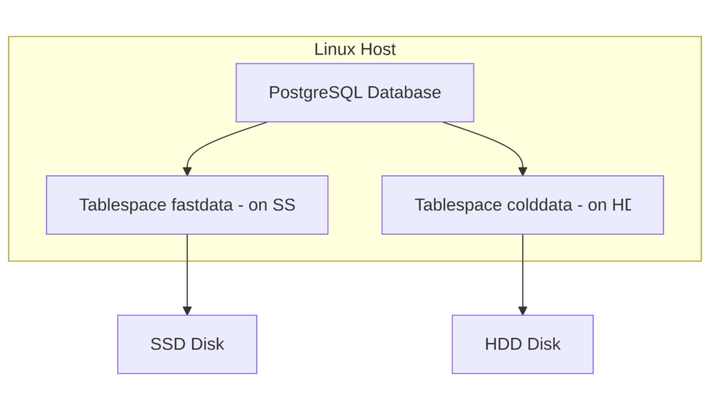 Well Linux or Unix as operating system is flexible on that matter and we can simply add diffent types of disks and mount them on OS-level to make it accessiblel to PG. Then all we need to do is providing a folder structure with proper permissions to PG, create a new table space and make use of that for databases or even simple tables within databases.